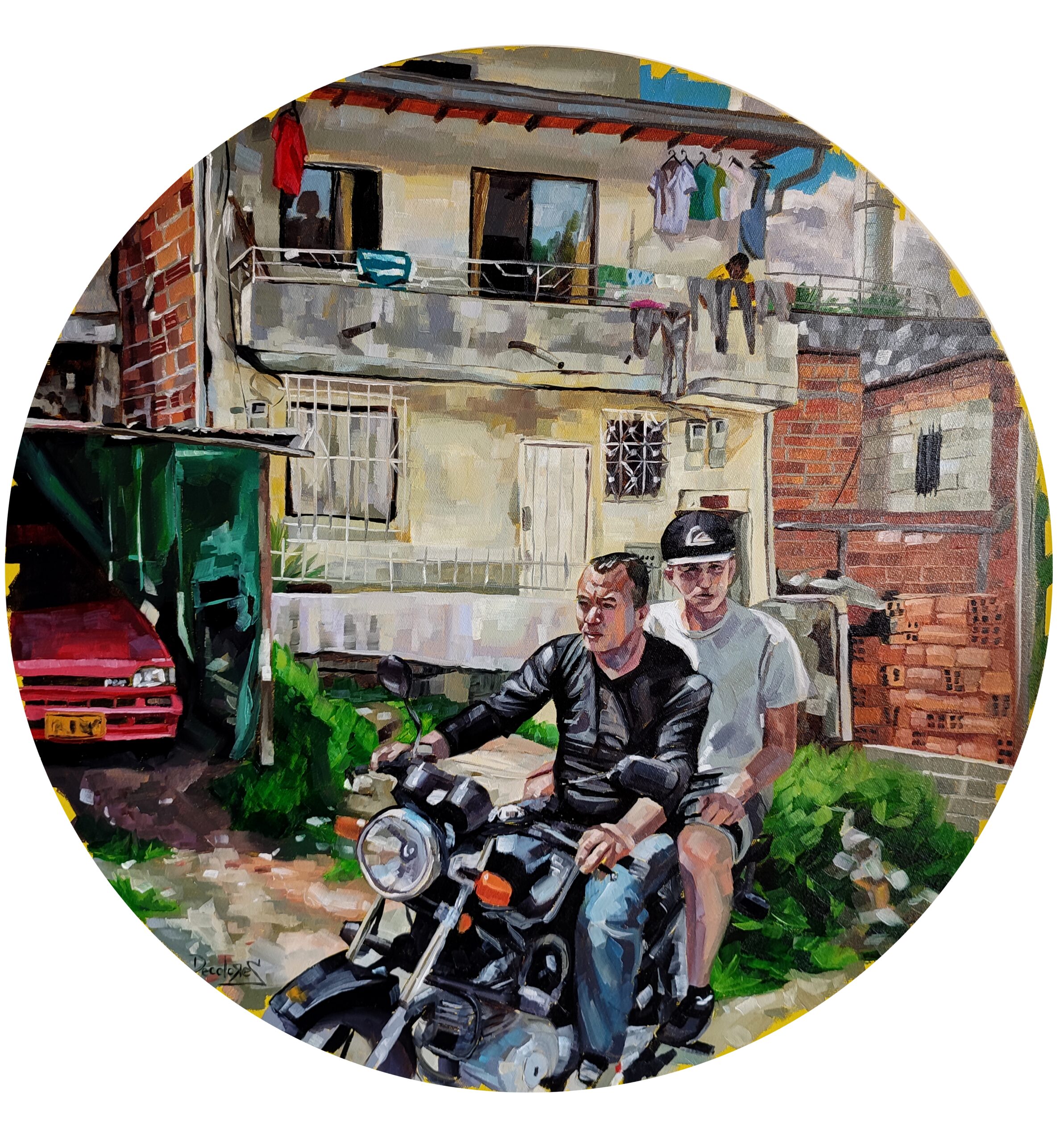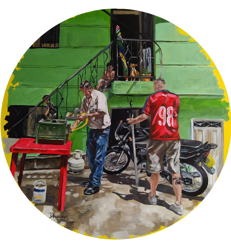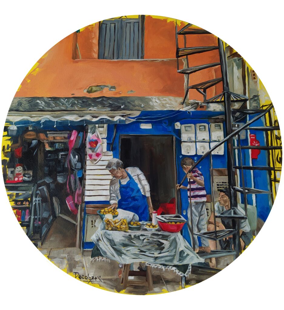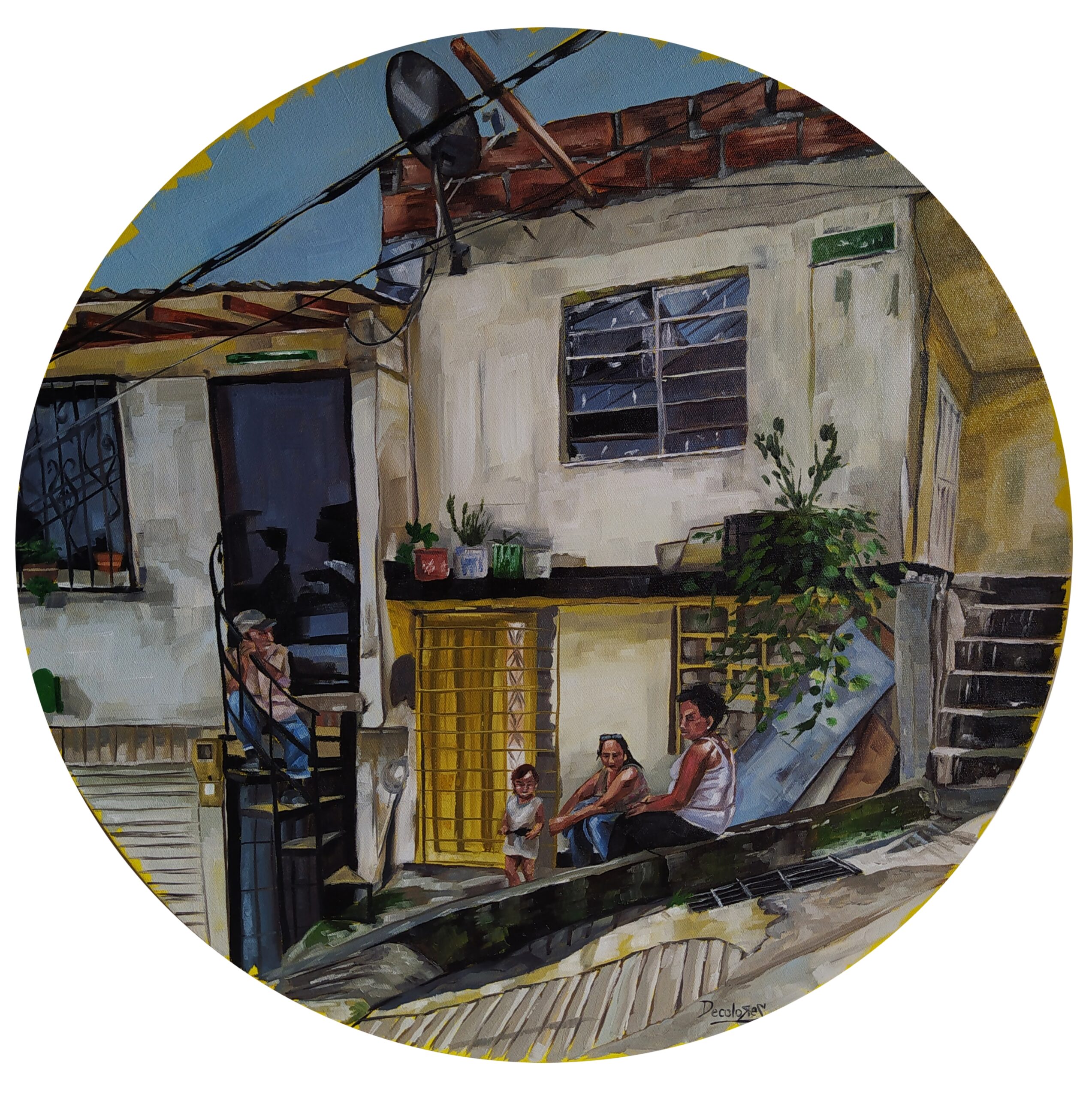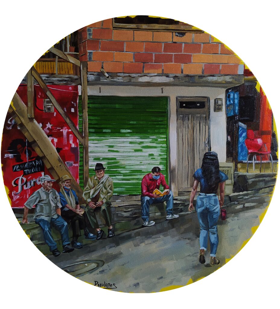 Es una serie que reflexiona sobre cómo construimos hogar en las periferias de Medellín. A través de escenas cotidianas y pinceladas luminosas, exploro el vínculo entre el espacio urbano, la memoria y el acto de habitar.