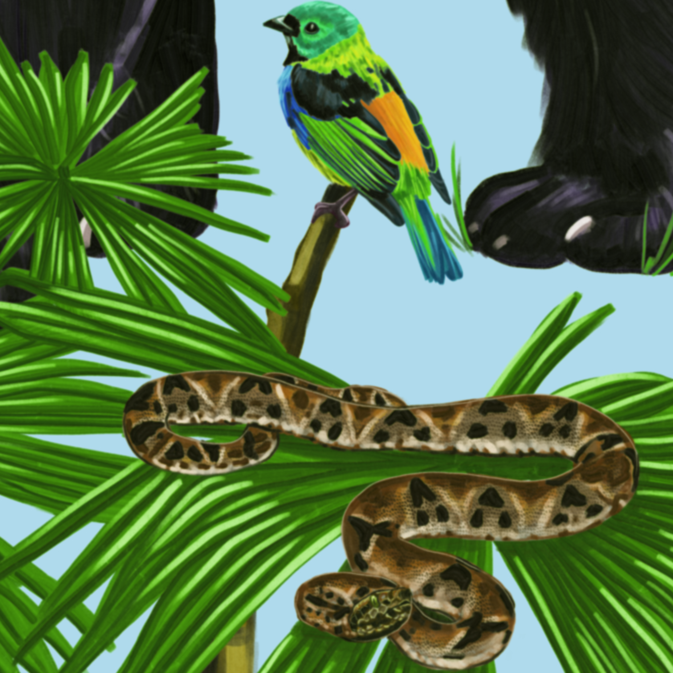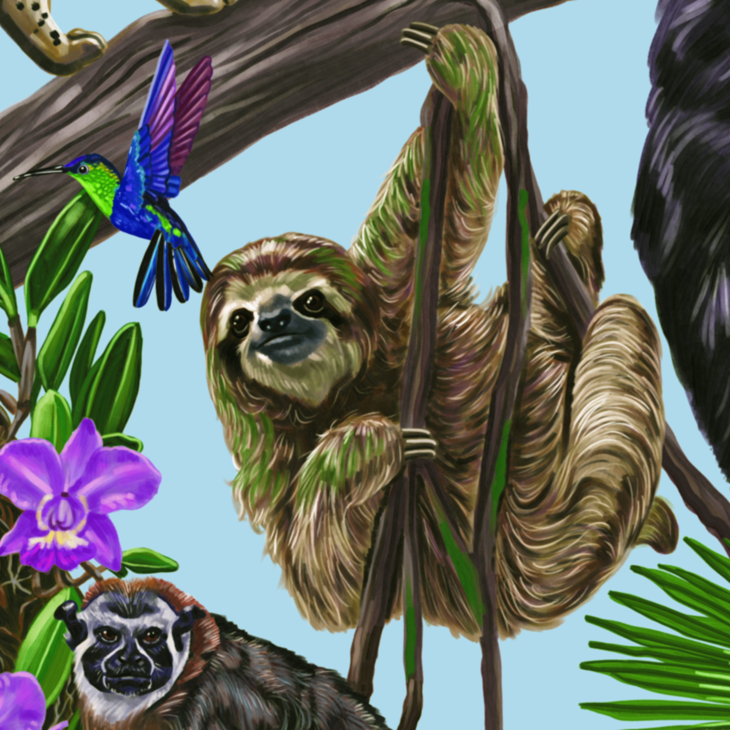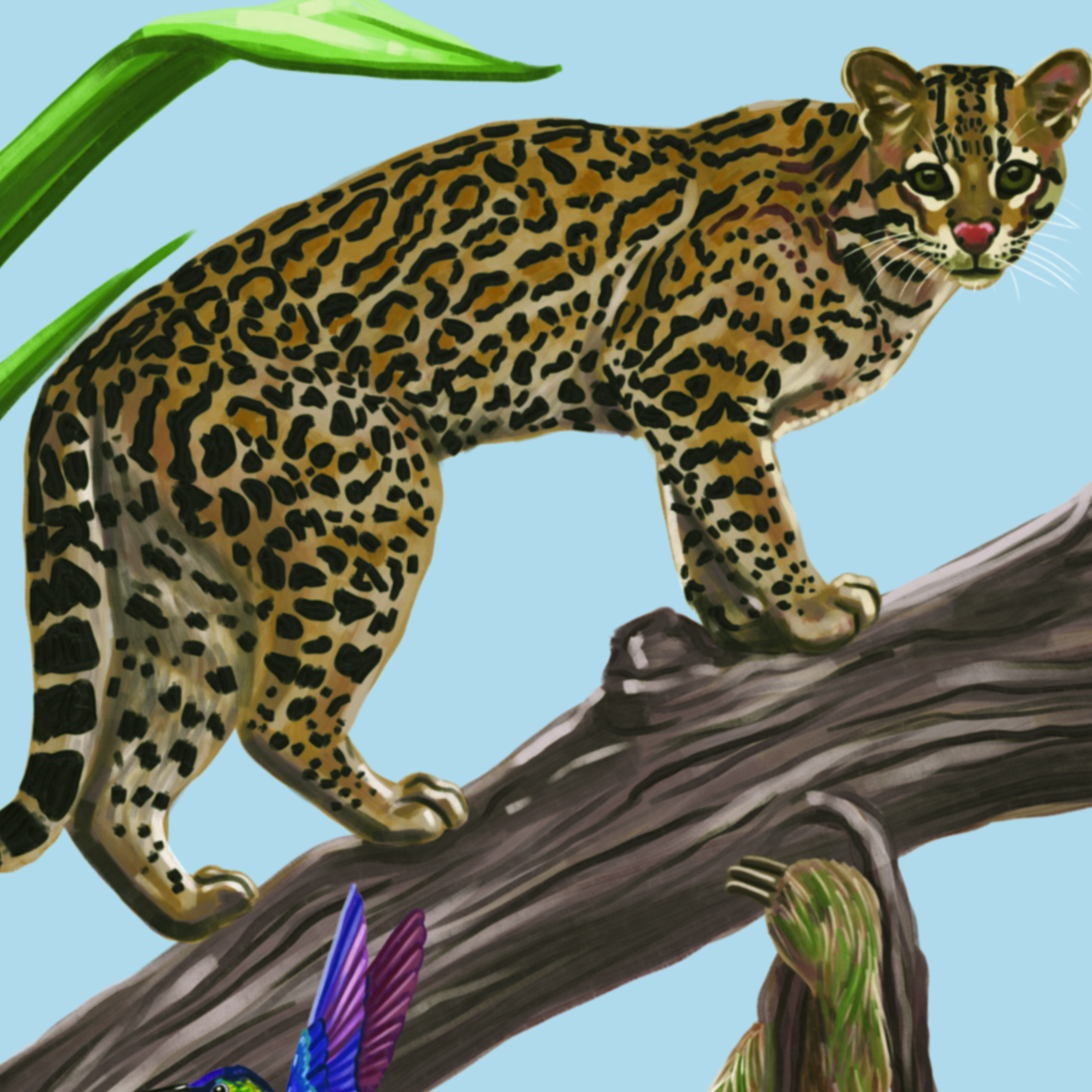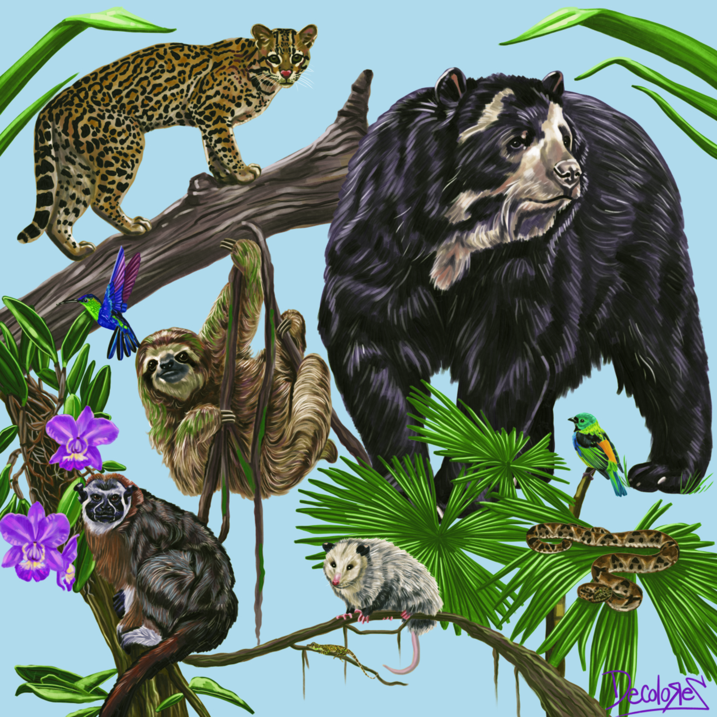 Ilustración en gran formato sobre especies de fauna y flora para el municipio de Anorí, Antioquia.