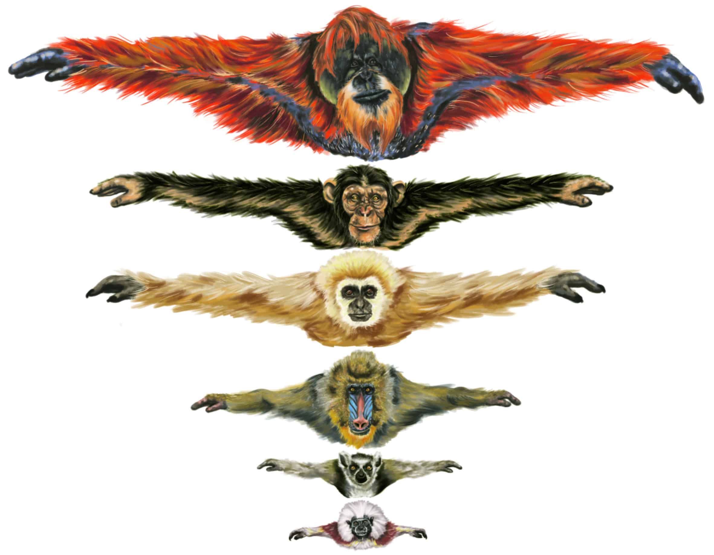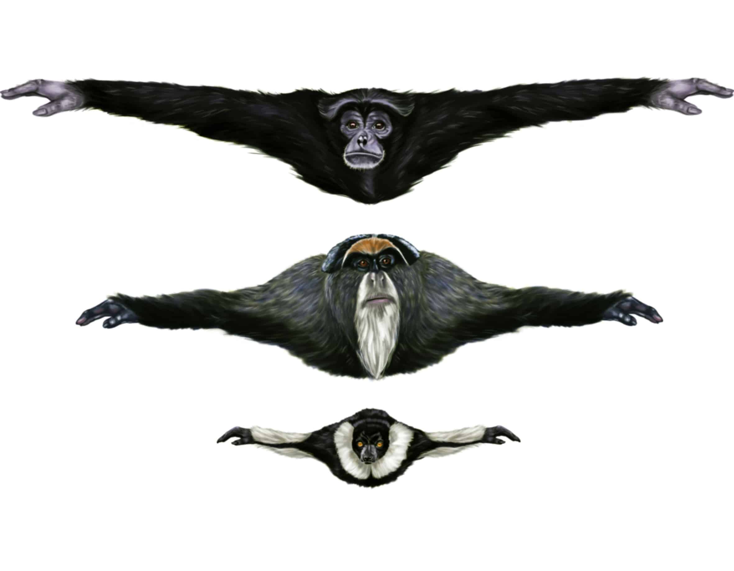 Ilustraciones científicas que comparan los tamaños reales de distintas especies de simios, destacando sus características morfológicas.