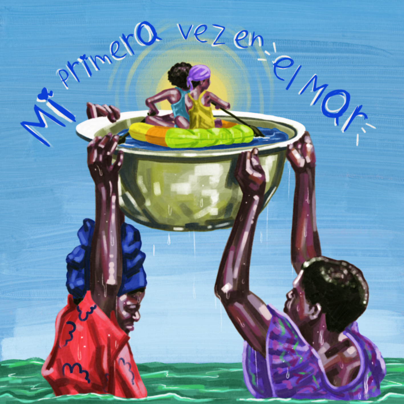 Ilustraciones de portada, contraportada y páginas interiores del libro Mi primera vez en el mar, escrito por la autora Sara Escribidora.