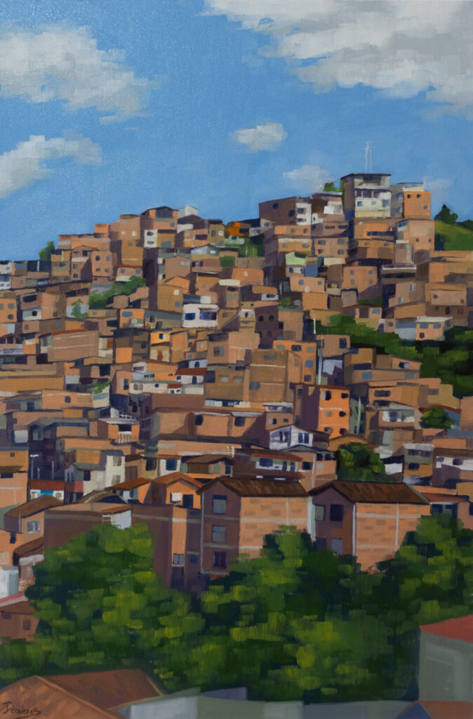 Es una serie que reflexiona sobre cómo construimos hogar en las periferias de Medellín. A través de escenas cotidianas y pinceladas luminosas, exploro el vínculo entre el espacio urbano, la memoria y el acto de habitar.