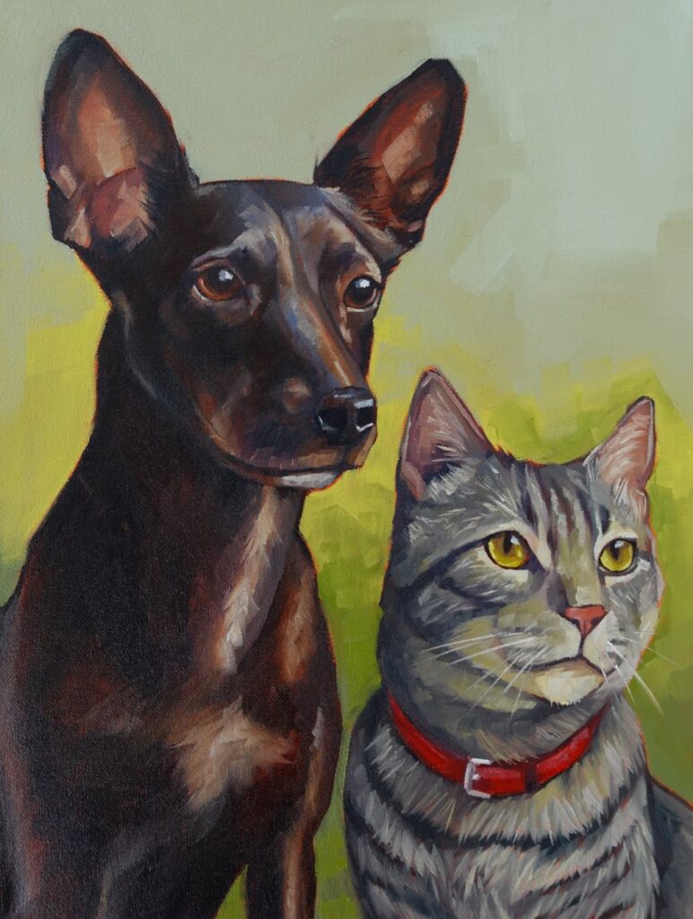 Trabajo cada retrato de manera personalizada, a partir de fotos y conversaciones donde me cuentan sobre la personalidad de la mascota. Pinto con óleo sobre lienzo, cuidando cada detalle para reflejar su esencia con respeto y cariño. Puedes elegir el tamaño y si quieres incluir más de una mascota en la misma obra.